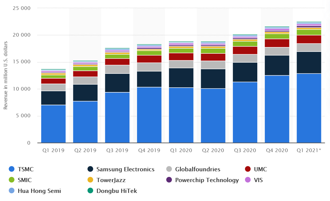 На данный момент ведущими производителями полупроводников являются тайваньская Taiwan Semiconductor Manufacturing Company (TSMC) и южнокорейская Samsung. Первая занимает 54% рынка, вторая — 17%.