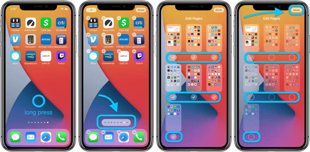 2. Теперь вы должны увидеть все страницы главного экрана. Снимите флажок на странице главного экрана, которую вы хотите скрыть. Не забудьте нажать Готово в правом верхнем углу, чтобы подтвердить изменение.