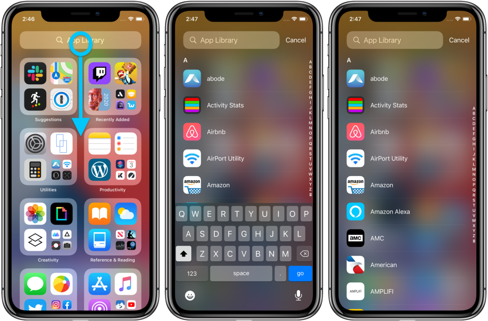 - Потяните вниз от верхней части библиотеки приложений, чтобы увидеть алфавитный список всех приложений
