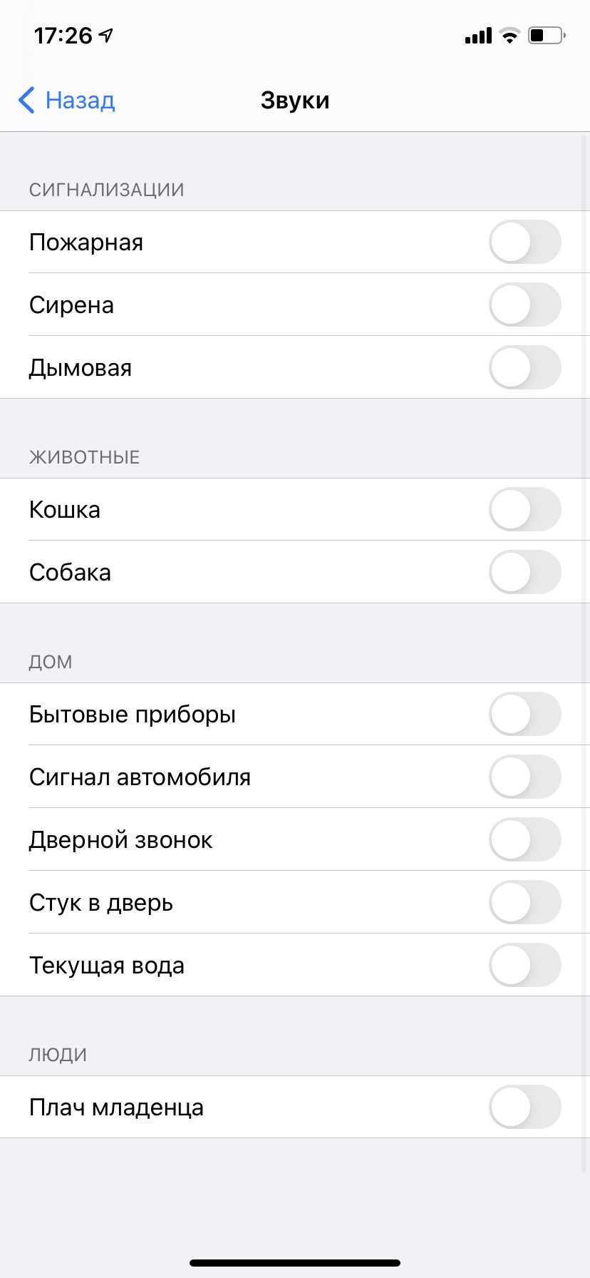 - Распознавание звуков. Фишка «Универсального доступа», которая позволяет настроить, какие звуки смартфон должен отслеживать и присылать уведомления о них. Например, лай собаки или пожарная сигнализация;