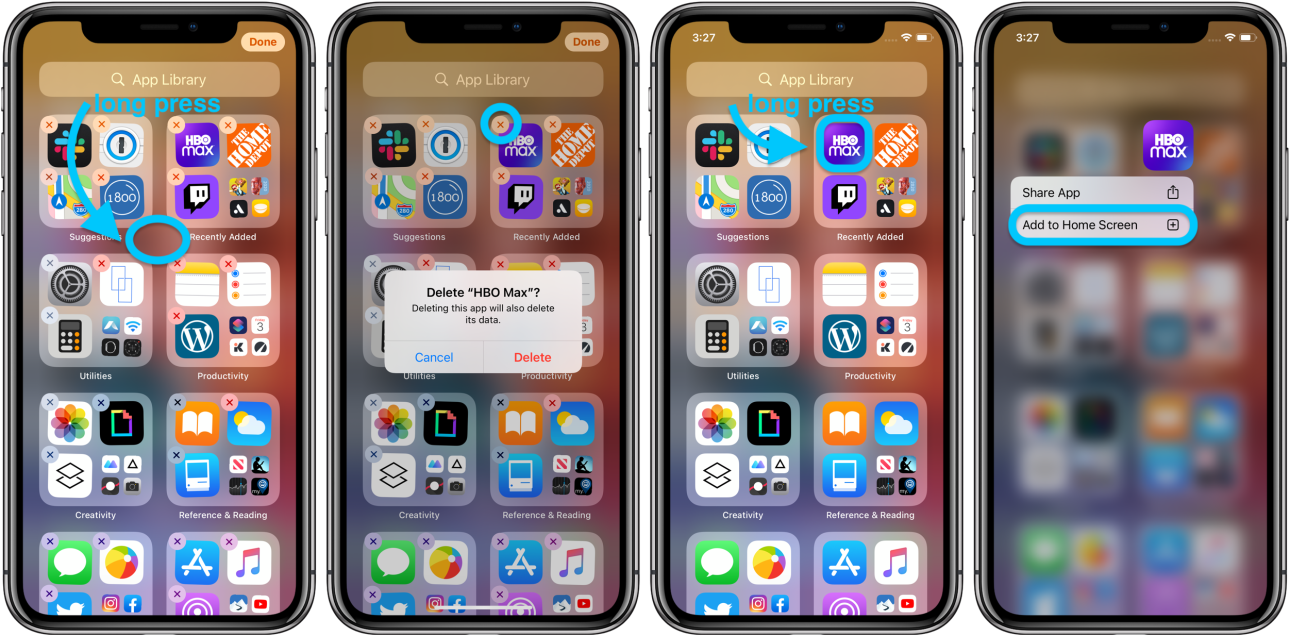 - Длительное нажатие на отдельное приложение в библиотеке приложений, чтобы добавить его обратно на главный экран