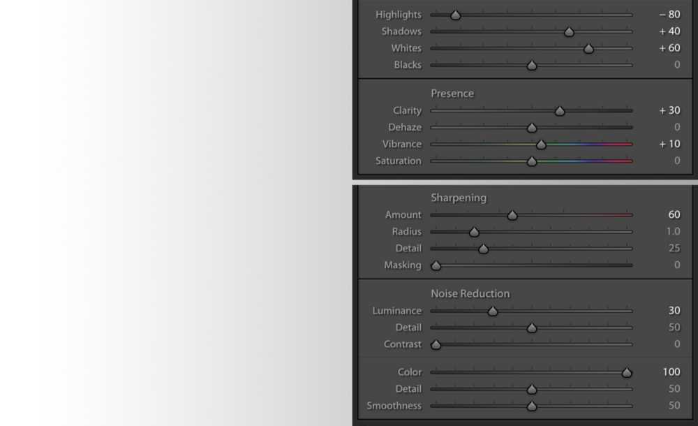 Раздел Basic (Основной):Highlights (Света) -80Shadows (Тени) +40Whites (Белые) +60Clarity (Чёткость) +30Vibrance (Сочность) +10