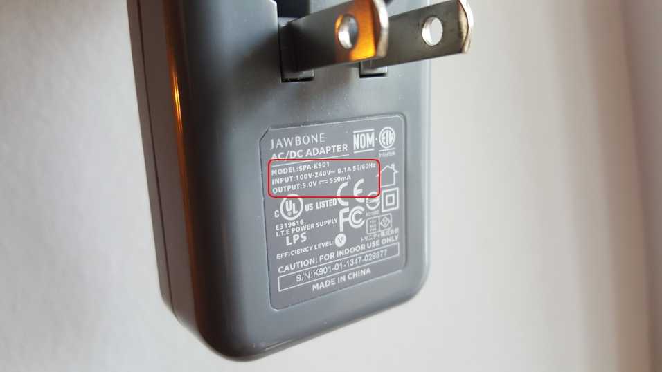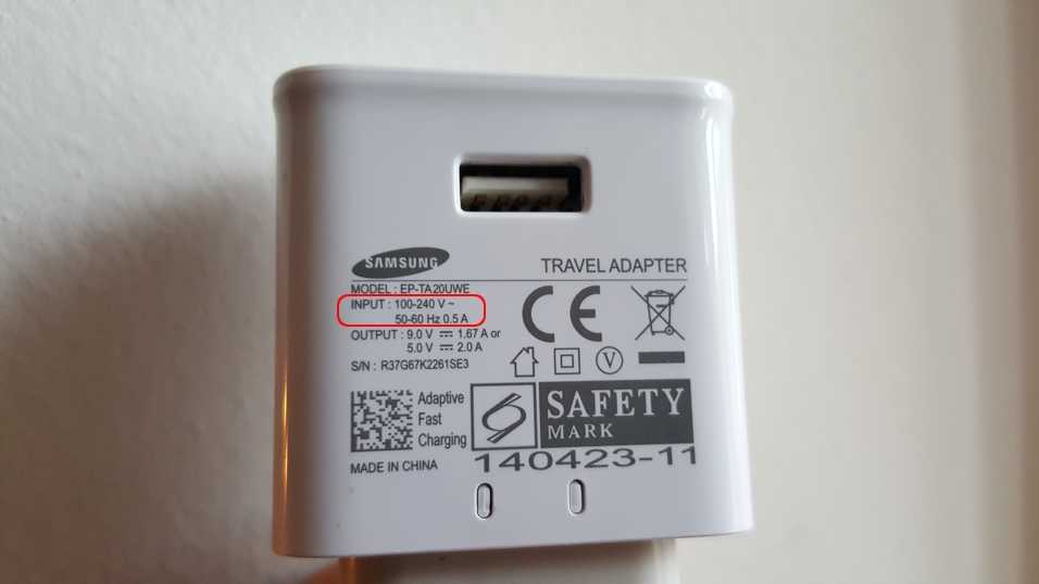 Вот стандартное зарядное устройство смартфона Samsung. В графе допустимого входного напряжения – «INPUT», указан диапазон от 100 до 240 вольт. Это означает что вы без проблем можете использовать его по всему миру.