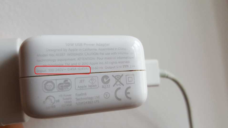 Аналогичным образом выглядит зарядное устройство планшета Apple iPad, тот же диапазон напряжений: 100 – 240 вольт.