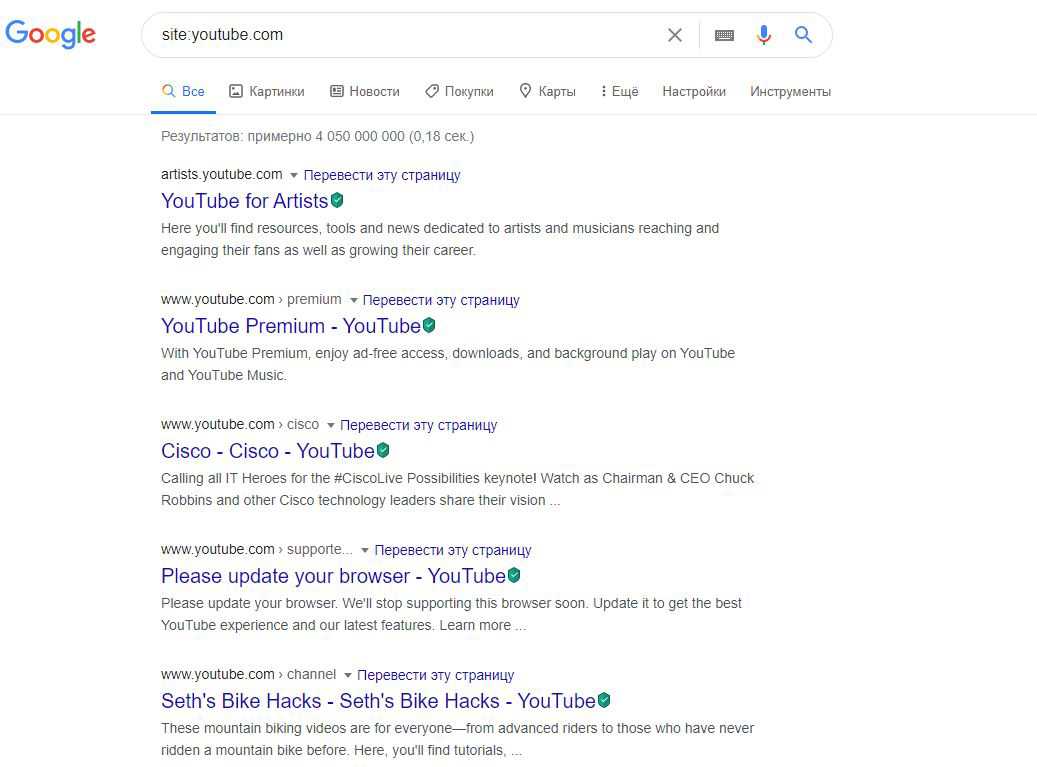 Если мы хотим найти общее количество видео на YouTube, мы будем использовать оператор “site”. Для начала просто вобьём в строку поиска “site:youtube.com» (без кавычек) и посмотрим, что получится: