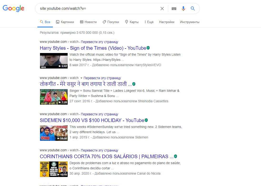Давайте попробуем еще раз обратиться к поиску гугл, но с конкретным оператором сайта. Вобьём такую фразу: “site:youtube.com/watch?v=”. И посмотрим, какой результат будет теперь: