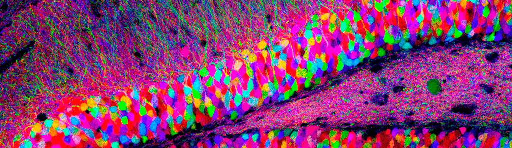 Рисунок 1. Множество нейронов в срезе гиппокампа крысы. Клетки помечены различными флуоресцентными белками с помощью технологии Brainbow.