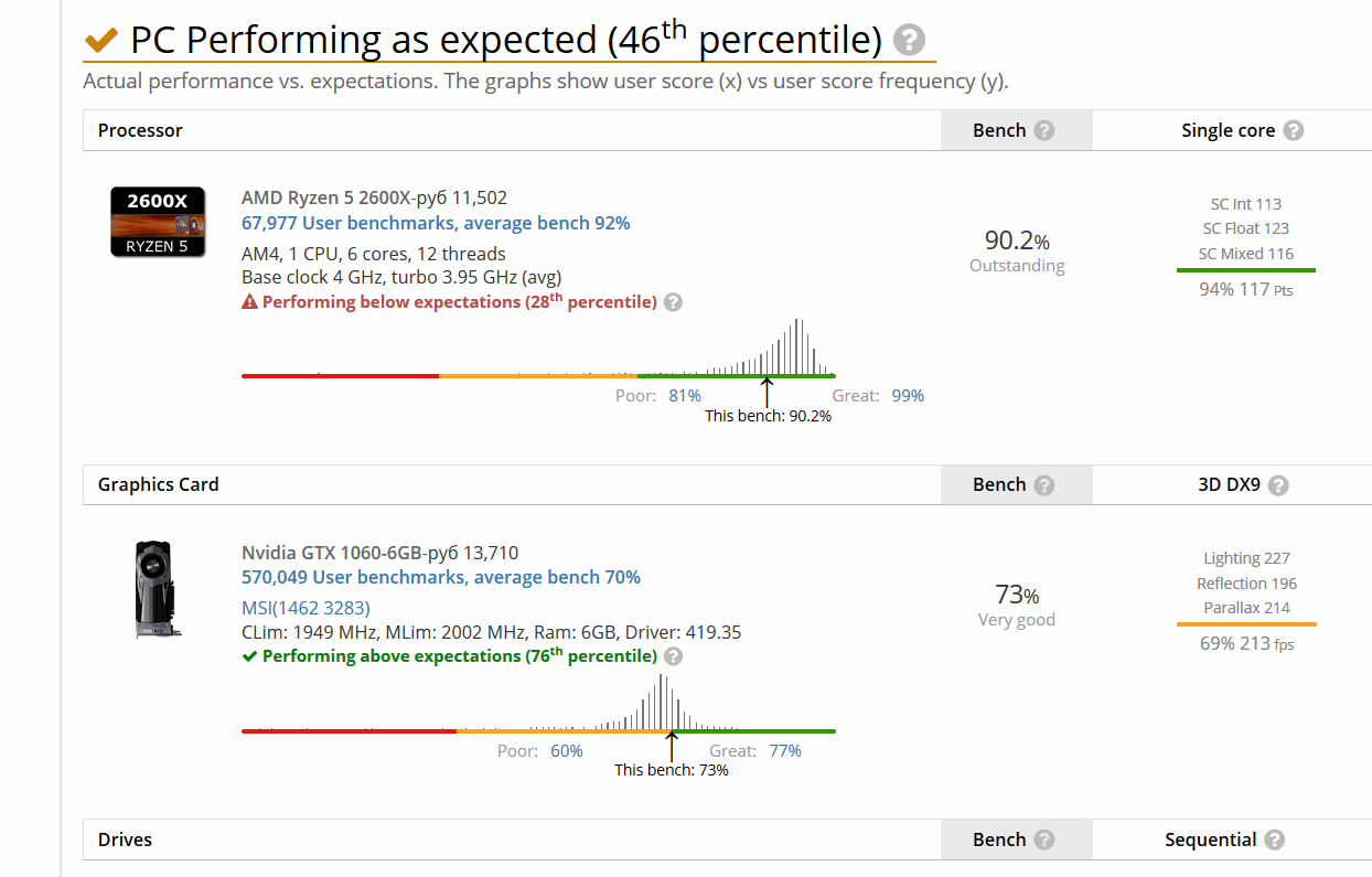 Что тут показано? Тест собирает ваши данные и отправляет на сам сайт, где они сравниваются с другими. За эталон (100%) принята некая «железка» (проц, видюха, винт и прочее), относительно которой считаются ваши показали. Вот стрелки на красно-желто-зеленых полосах — это то, сколько баллов вы набрали относительно эталона. Чем правее стрелка, тем лучше. Но, это еще не все.