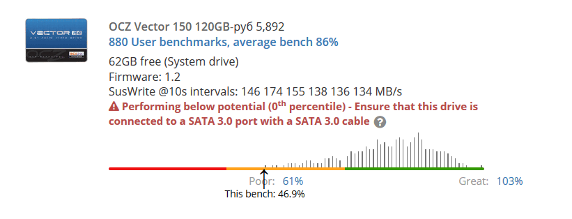 Видим, что диск, хотя и попадает в желтую зону, но работает гораздо хуже, чем у других тестировавших его в этом сервисе