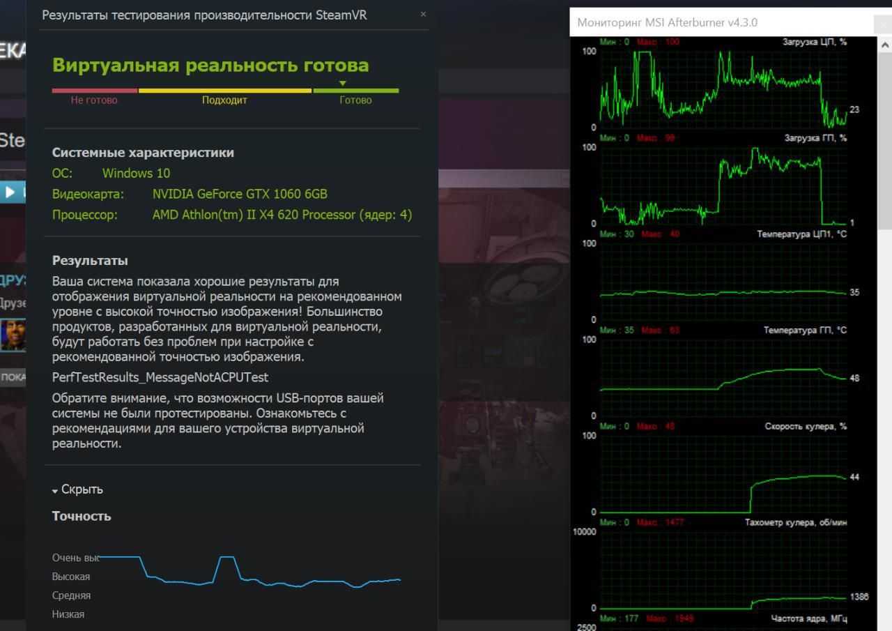 Комбо: афтебурнер + Steam VR тест. Тест еще на старом проце, но, уже на новой видюхе.