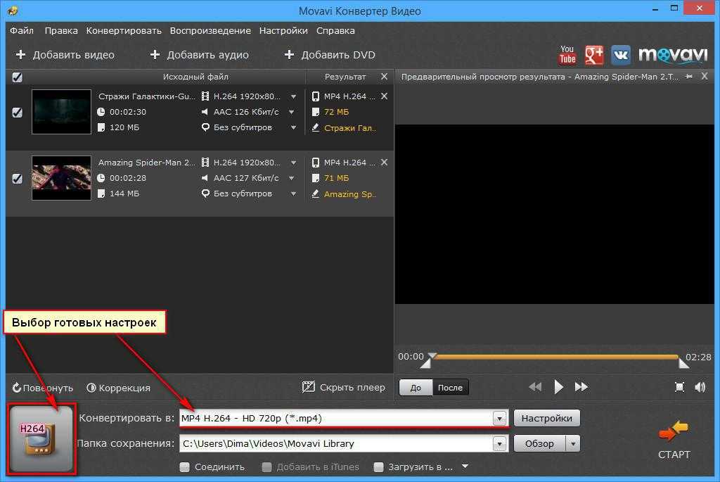Выбираем настройки конвертации видео