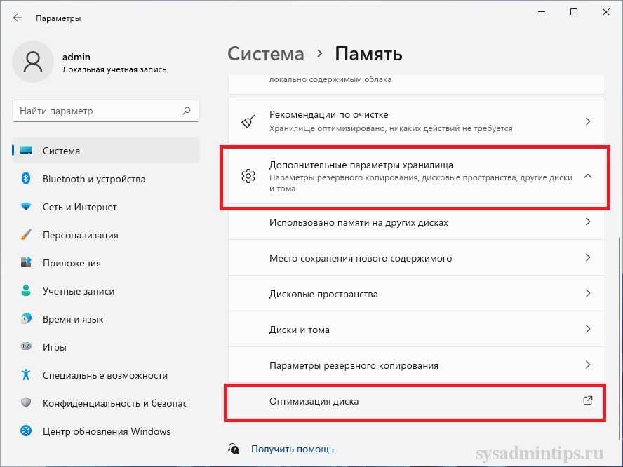 Далее нажмите на пункт “Дополнительные параметры хранилища”, а затем выберите опцию “Оптимизация диска” из списка, представленного на экране.