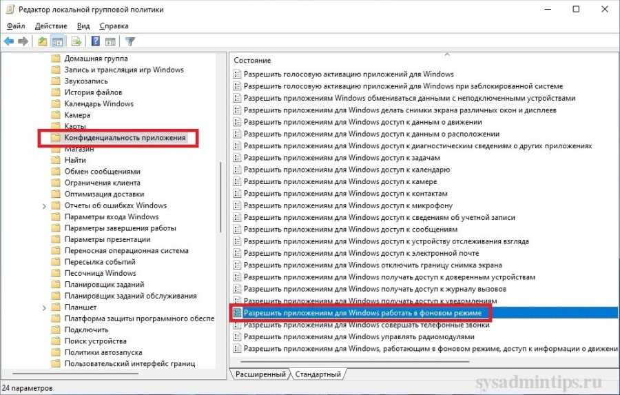 Найдите раздел “Конфиденциальность приложения”, развернув “Компонеты Windows” в “Администратоивных шаблонах” конфигурации компьютера.