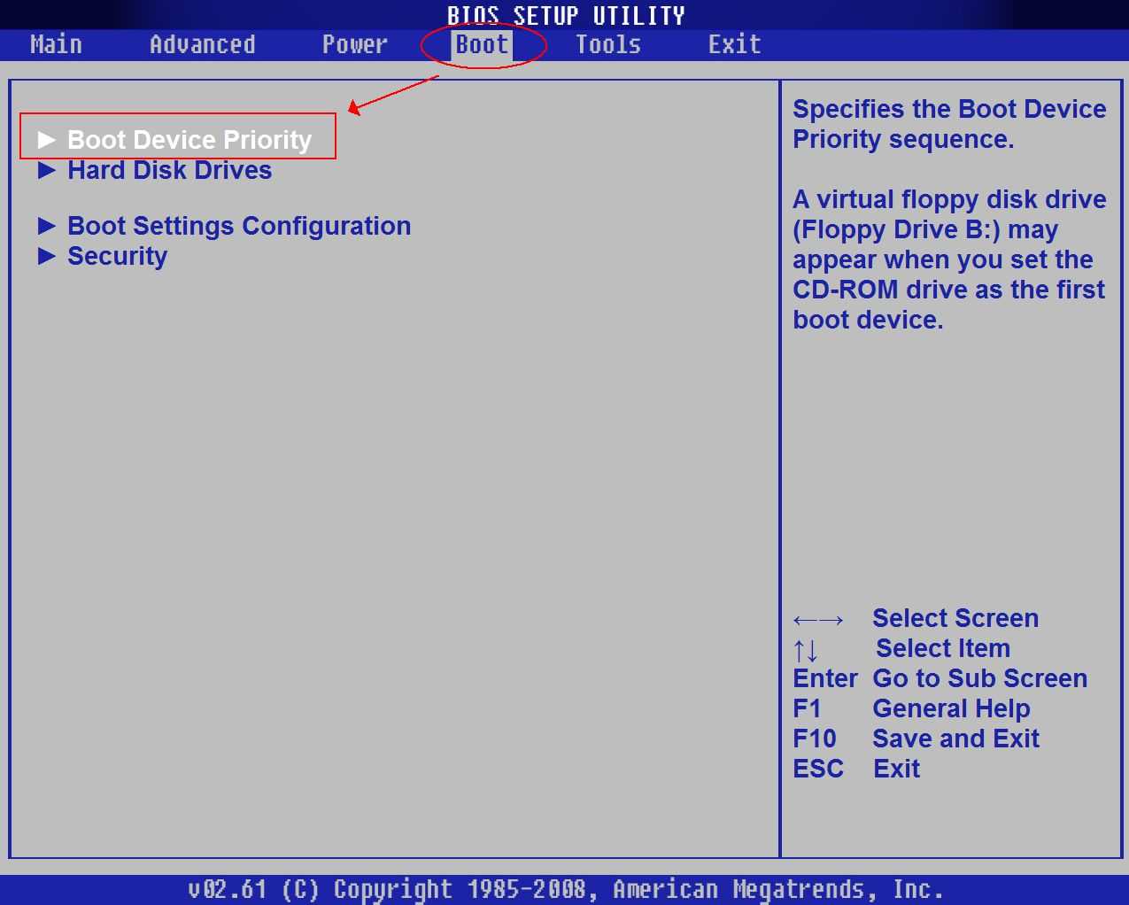 Здесь разрешается определять приоритетный накопитель, выбирая между флеш-картой, дисководом или винчестером.